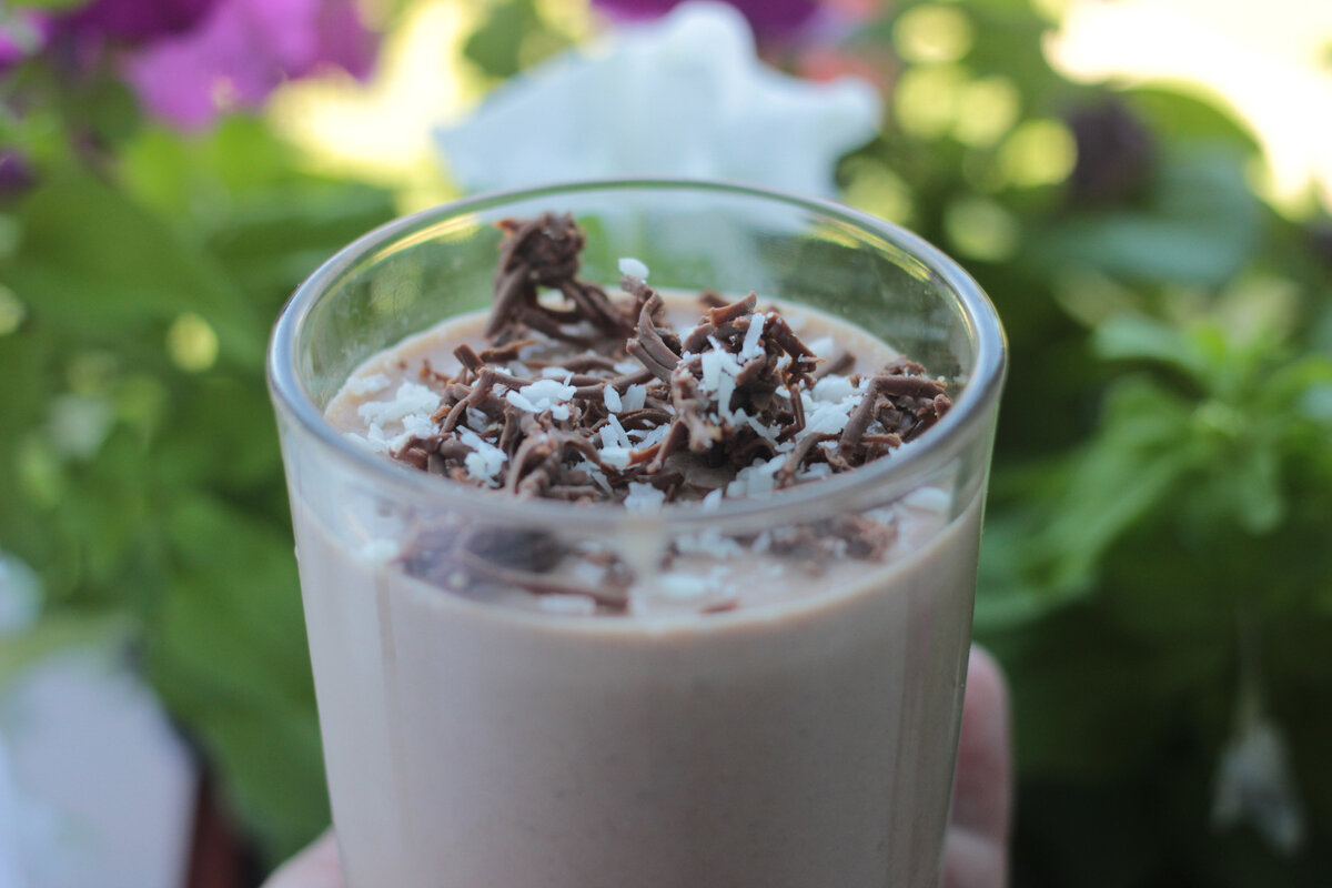 Желе - это мое самое любимое блюдо с детства. Я его обожаю даже больше мороженого и пирожных. А сейчас, когда пытаюсь скинуть килограммы осевшие на боках в период грудного вскармливания, желе особенно выручает. Недавно открыла для себя новый вкусный рецепт на основе ряженки и желатина. Вариации приготовления разные. Мне понравилось с использованием бананов. Для приготовления понадобятся следующие продукты 450 мл ряженки; Пара зрелых бананов (зрелые слаще); 2 чайные ложки какао порошка (можно и без него, но я использую для оттенка); Сахар по вкусу (я сахар заменила двумя маленькими пакетиками сах.зама фит.парад); 15 грамм Желатина; 50 мл холодной кипяченой воды. Для украшения по желания Чайная ложка кокосовой стружки; Немного тертого шоколада (использовала горький). Приготовление 1. Высыпаю сухой желатин в чашку, заливаю холодной кипяченой водой и оставляю на 10 минут набухнуть. Нагреваю его на плите до растворения крупинок. Кипятить нельзя. 2. Ряженку, бананы, какао и сахар взбиваю