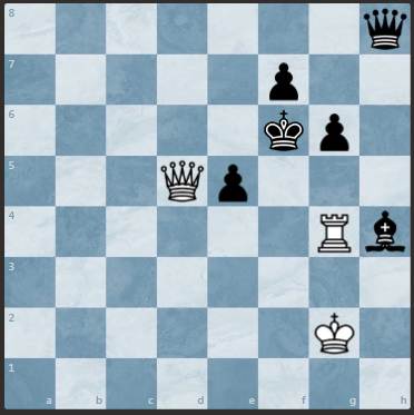 Шахматная задача. У черных перевес: слон и три пешки, против белой ладьи. Ход белых, и они выигрывают (получают материальный перевес). Подписывайтесь на канал, и будут новые интересные задачи Решение смотрите далее. Смотрите более сложную задачу с жертвой ферзя тут>>> 1. Белые бьют ладьей на h4 1. ...... черные бьют ферзем на h4 2. Белые - ферзь d8, шах и далее выигрыш черного ферзя.