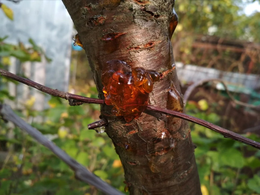 Появление этого "фруктового янтаря" с привкусом древесины является тревожным симптомом грибкового заболевания, которое может привести к гибели культуры. Камедь содержит сахаристые вещества, кислоты и другие ценные компоненты. При ее появлении нарушается процесс фотосинтеза, необходимого для жизни растения.