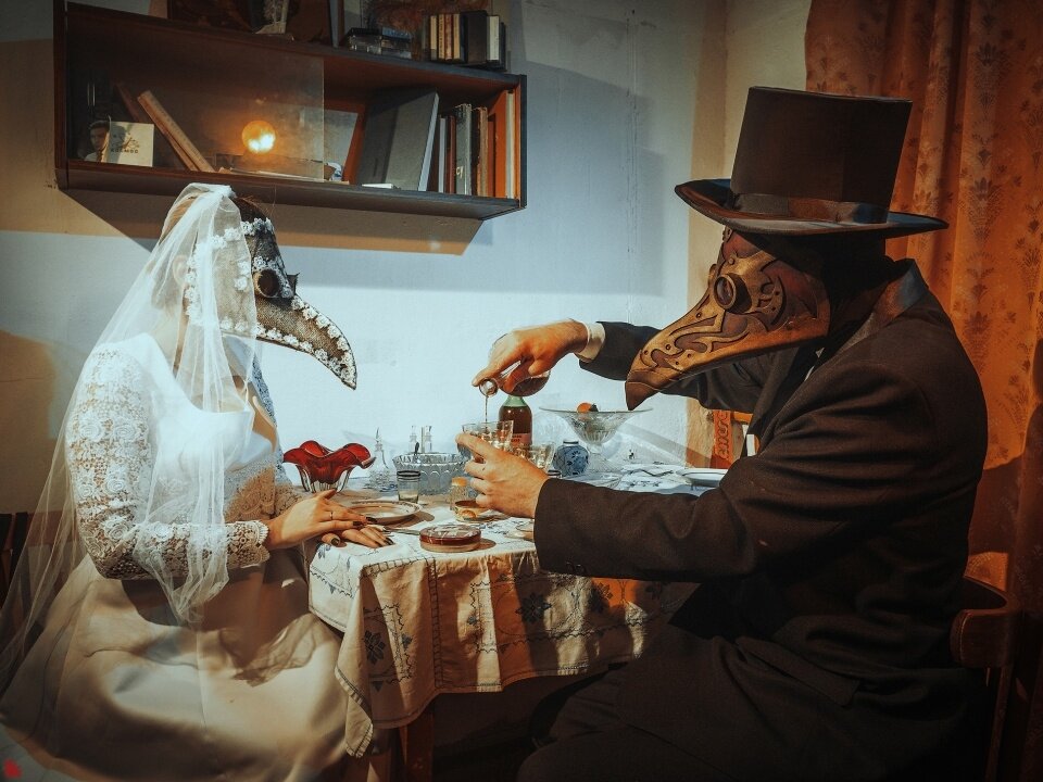 Различные религии на протяжении всей истории реагировали на пандемии, молясь или пытаясь успокоить высшую власть. Во время Черной чумы Христианское Братство Флагеллантов прошло через Европу, забивая себя бедствиями, чтобы заслужить Божью милость. Мусульмане отреагировали на ту же пандемию, придав большее значение общинным формам молитвы, таким как шествия и массовые похороны. В некоторых восточноевропейских еврейских общинах одним из основополагающих ритуалов борьбы с чумой была свадьба на могиле, известная как чумная свадьба . Чумная свадьба - также называемая черными свадьбами, или шварце хасене на иврите - вероятно, произошла во время вспышек холеры, которые разорили Европу в течение 19-го века. В основе Шварце Хасене была мысль о том, что проведение священной церемонии среди мертвых сделает участников и свидетелей более вероятными кандидатами на божественное вмешательство, поскольку, согласно еврейской традиции, свадьбы приближают людей к Богу. Считалось, что даже аксессуары, свя