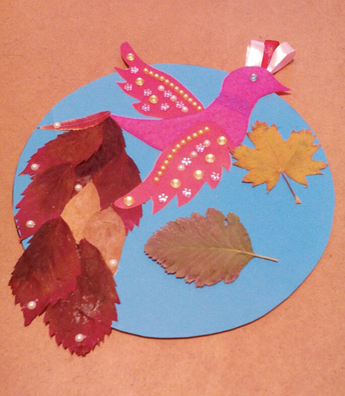 Праздник праздником, а именины и дни рождения в большой семье случаются часто. И каждому надо преподнести именной подарок, который понравится виновнику торжества и запомнится надолго. Поделка, сделанная своими руками, будет вдвойне дороже. Приступаем к изготовлению сказочной птицы из природного материала. Приготовьте для работы: Инструменты: Вырезаете и наклеиваете на пластинку фоновый картон, не совпадающий с цветом образца. Ножницами отсекаете лишнее. Кто будет пользоваться только картоном, силуэт можно сделать сразу на нём с изнанки. Прикрепляете синий страз на место глаза. Сажаете фигуру птицы на крепкий клей так, чтобы голова была немного выше контура диска. Берёте сухие листики и формируете пышный шлейф. Прикладывайте листья друг на друга, хорошо смазывая клеем их поверхность. Затем ставите под тяжёлый груз: толстую книгу или холодный утюг. Хвост у жар-птицы красивый и большой. Пусть он зайдёт за рамки всего изделия – не страшно. Приступаете к изготовлению хохолка.