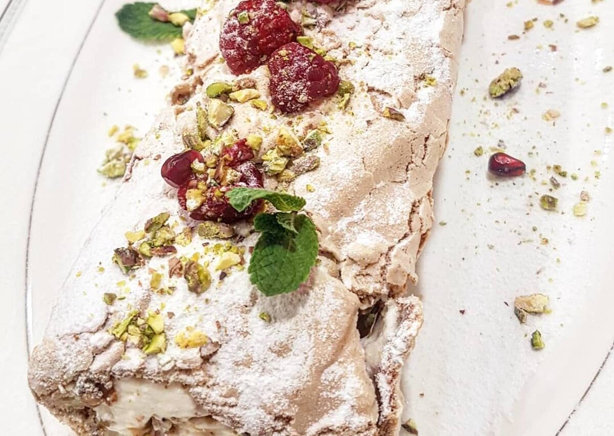 Украшаем ягодами и сахарной пудрой и молотыми фисташками, ставим в холодильник.