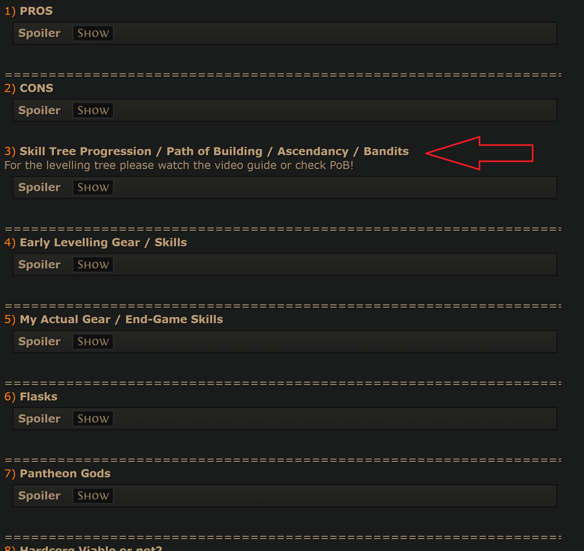 Greeting you, Exile! Пишу данное пособие для тех, кто решил попробовать Path of Exile, но не знает с чего начать и как к ней подступиться. Игра изобилует множеством механик и тонкостей, поэтому я буду давать вам информацию дозировано, не вываливая на вас кучу непонятной информации, которая в самом начале для вас будет бесполезна. И так приступим. Прежде всего, стоит отметить, что вам нужно найти гайд. Либо на самом официальном сайте игры, либо на вот этом сайте, где множество билдов отсортированы по классам и умениям/скиллам. Возьмем в качестве примера вот этот гайд. Да, гайд на английском, но так уж получилось, что большинство хороших гайдов на английском. Но и на русском есть хорошие гайды, например этот. Окей, мы выбрали гайд. Мы тут видим: видео геймплея, небольшое описание того как этот билд в принципе работает, плюсы(PROS) и минусы(CONS). Но для вас, как для начинающего, должен быть интересен вот этот раздел Открыв его, нас должна интересовать только одна строчка: Path of Buildi