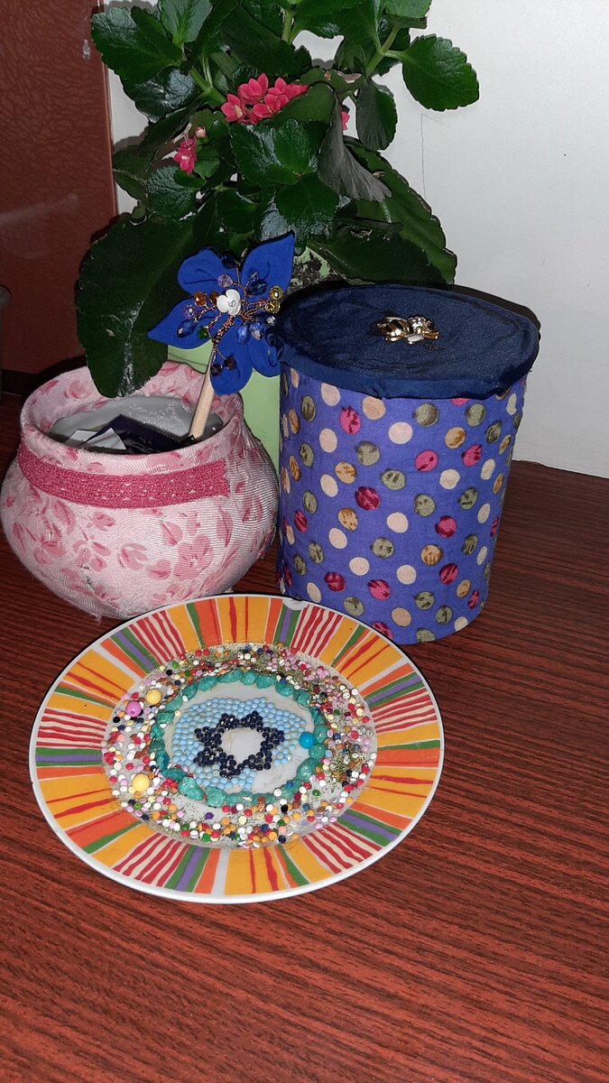 Была у меня белая скучная сахарница без крышки и две жестяные баночки от детского питания,и мне захотелось их украсить и преобразить,чтоб они заняли достойное место на моих полках,я взяла осттатки ткани от двух любимых платьев и вырезала кусочки,и приклеила их на простой клей карандаш,чтоб не было видно просветов,и украсила их декоративными элементами,клеить оказаловь очень легко ,а получились две вот такие чудо банки - шкатулки,как вам моя идейка преображения посуды в диковинку для интерьера?