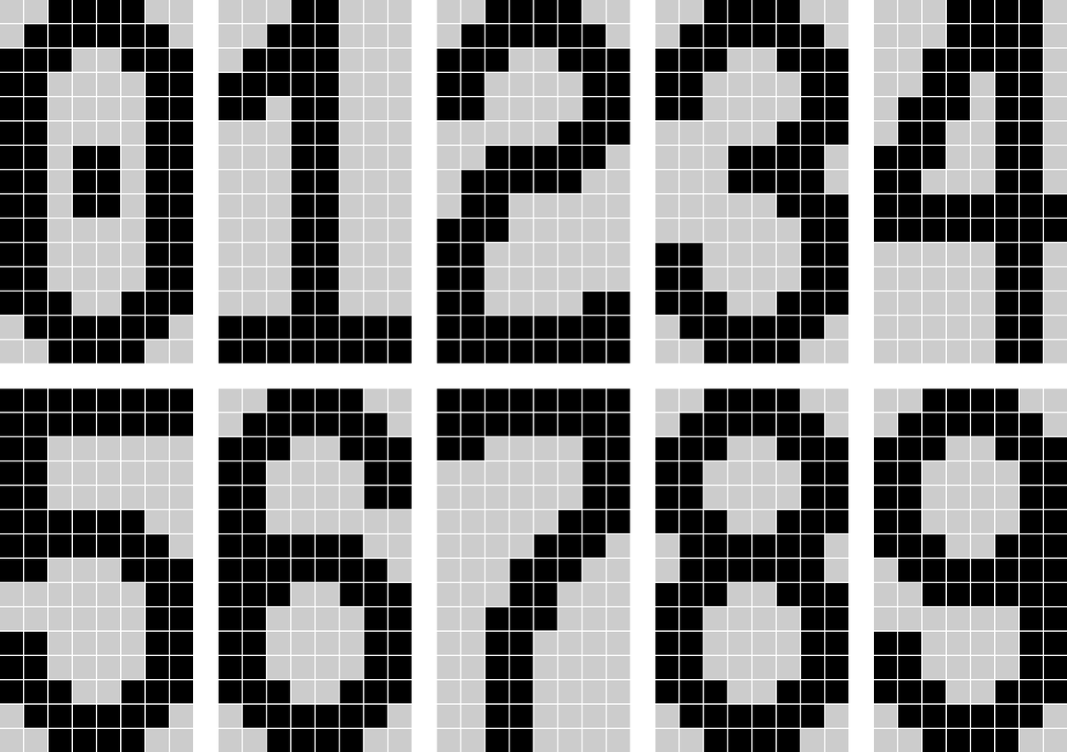 По технологии это практически не отличается от рисования фигур Тетриса, закодированных двоичными числами. Цифры тоже будут закодированы. Кажда цифра шириной 8 пикселов и высотой 15 пикселов. Чтобы закодировать графику для одной цифры, нужно 15 байт.