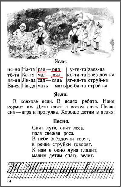 Все мы знаем, что йотированные гласные, которые имеют двойное значение (йа, йо, йу, йэ) сейчас изучают чуть ли не с пеленок. А это очень сложная тема, тем более для детей 7 лет. Как же изучали эти буквы в 40-50 годах? Расскажу на примере букваря Воскресенкой А.И. (обр.1952г) Йотированные гласные (е,ё,ю,я) изучались в два этапа, т.е. в два урока. 1 Этап. Гласная в начале слова. Брались слова типа: ю-ла, я-ма, ё-жик т.д. . Т.е. выделяли слог, и говорили, что этот слог обозначается вот этой буквой. Так на первом этапе, происходило знакомство с буквой. И это было главной целью, целью познакомить именно с буквой. 2 Этап. Гласная после согласного. Здесь происходило сравнение слов исключительно практическим путем, т.е. сравнивались слова типа: мал/мял; воз-вёз; тук/тюк и т.д. При этом строго запрещалось тянуть эти звуки, только короткое произношение, иначе было бы слышно второй звук (например йаааааа –буква «я», йуууууу – буква ю). Т.е. это первый этап изучения йотированных