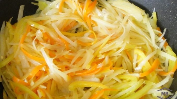 Интересное блюдо, которое быстро готовится. Картофель по-китайски радует своей ни с чем не сравнимой ноткой вкуса. Стоит попробовать! Процесс приготовления: Очищенные картофель и морковь нарезаем максимально тонкой соломкой. Болгарский перец также нарезаем тонкой соломкой, лук — полукольцами. Соломку картофеля промываем водой несколько раз. Так картофель не потемнеть в процессе жарки. Промытую картофельную соломку обсушиваем на бумажном полотенце, убирая лишнюю влагу. Кабачковая лапша — отличный вариант гарнира Теперь готовим заправку для блюда. Смешиваем в пиале уксус с соевым соусом. Как приготовить куриную печень в кляре Ставим на плиту сковороду на небольшой огонь. Добавляем масло и обжариваем лук около минуты. Затем добавляем морковь, не забываем всё периодически помешивать. Обжариваем морковь с луком около двух минут. Теперь добавляем картофельную соломку. Помешивая всё, обжариваем массу около пяти минут под закрытой крышкой. Когда картофель почти готов, добавляем болгарский пер