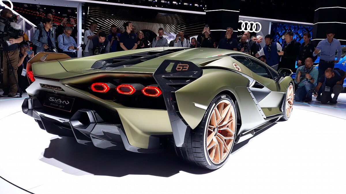 Выглядит автомобиль просто невероятно. Он поражает воображение. Но при этом марка узнаётся абсолютно безошибочно. Основные изменения внешнего вида по сравнению с другими моделями – острые грани и «наложение» панелей друг на друга. Одна форма оптики чего стоит. Также в видео обзорах отмечают особый цвет, который просто невозможно описать словесно, и необычный дизайн колёсных дисков. Здорово смотрится и этажерка, прикрывающая сексапил 12-цилиндрового, расположенного в базе мотора, естественно переходящая в панорамный люк крыши. Ну и, конечно, активная аэродинамика – куда ж без нее? Например, активные охлаждающие лопасти “включаются” лишь при определенной температуре. Или огромное, как плащ Бэтмена заднее антикрыло, которое до поры прячется в задней части кузова, а в поднятом рабочем положении выглядит просто устрашающе. Антикрыло таких размеров “Сиану” не помешает – ведь 819-сильных “Ламборгини” еще не было! Основная вклад в мощностной потенциал вносит 6,5-литровый V12 (785 л.с.), элект