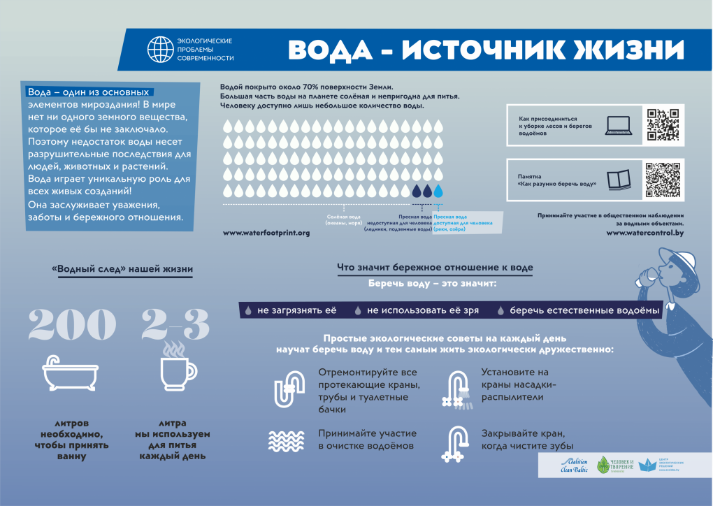 Эта простая «арифметика» показывает, почему нам стоит беречь воду и минимизировать наш «водный след». Да, каждый из нас оставляет водный след в течение жизни! Например, для питья мы используем примерно 2-3 литра в день, а принятия ванны – порядка 200 л.