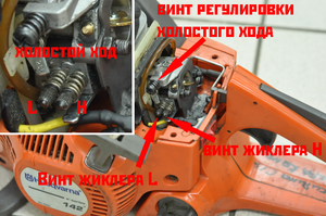 Использование бензиновых пил получило довольно широкое применение не только в профессиональной лесозаготовительной отрасли, но и в домашнем хозяйстве.На китайских бензопилах время от времени надо регулировать карбюратор . Остановите двигатель и ввинтите иглу H и иглу L до тех пор пока они не остановятся. Никогда не закручивайте их с усилием. Затем переместите их назад на начальное количество поворотов как показано ниже Игла H : ¾ ± 3/8 Игла L: 1 ½ ± ¼ Запустите двигатель и позвольте ему разогреться при половинном газе. Медленно поверните иглу L по часовой стрелке чтобы найти положение, в котором скорость при холостом режиме максимальна затем установите иглу на 1/4 оборота против часовой стрелки. Поверните винт регулировки холостого хода против часовой стрелки , так чтобы пильная цепь не проворачивалась. Если скорость при холостом режиме слишком мала, поверните винт по часовой стрелке. Сделайте пробный пропил и настройте иглу Н для наилучшей мощности резания, а не максимальн
