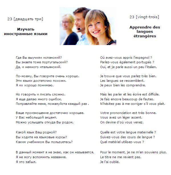 Французский язык. Урок 1. Французский язык. Урок 22. Добрый день! Продолжим изучение французского языка. Французский язык. Урок 23. 23 (двадцать три) - 23 (vingt-trois) Изучать иностранные языки - Apprendre des langues étrangères Где Вы выучили испанский? - Où avez-vous appris l’espagnol? Вы знаете тоже португальский? - Parlez-vous également portugais? Да, и немного итальянский. - Oui, et je parle aussi un peu l’italien. По-моему, Вы говорите очень хорошо. - Je trouve que vous parlez très bien. Эти языки достаточно похожи. - Les langues se ressemblent. Я их хорошо понимаю. - Je peux bien les comprendre. Но говорить и писать сложно. - Mais les parler et les écrire est difficile. Я еще делаю много ошибок. - Je fais encore beaucoup de fautes. Поправляйте меня, пожалуйста каждый раз. - N’hésitez pas à me corriger s’il vous plait. Ваше произношение достаточно хорошее. - Votre prononciation est très bonne. У Вас небольшой акцент. - Vous avez un léger accent. Можно услышать откуда Вы родом. -