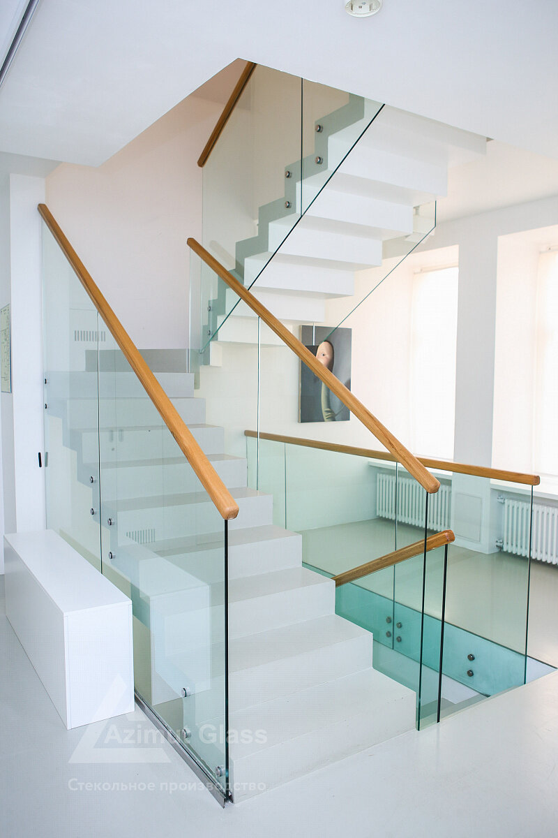Представляем наш новый проект по изготовлению и монтажу стеклянной лестницы по ул. Жукова. Для создания лестничных ограждений было использовано закаленное стекло с гладкой, полупрозрачной фактурой, с легким бирюзовым оттенком, создающее в пространстве ощущение легкости и чистоты. Стекло, использующееся для создания ограждений, было подвергнуто закалке, обеспечивающей изделию устойчивость к любым видам механических воздействий, перепадам температур и ультрафиолетовому излучению. Фиксация элементов ограждения была произведена на точечные крепления в сочетании с элегантными алюминиевыми стойками, установленными на площадке. В качестве точечных креплений использовались элементы монетного типа из нержавеющей стали, с регулируемым механизмом, позволяющим подгонять стеклянные панели под заданный угол зажима. В нижней части конструкции фиксация стоек была произведена на зажимные профили. В качестве дополнения к стеклянным полотнам были использованы поручни из натуральной древесины в светло-оре
