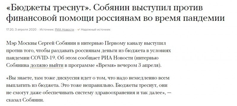 Совсем недавно, во время карантина, Собянин отказался оказывать финансовую помощь населению и бизнесу под тем предлогом, что "бюджеты треснут".