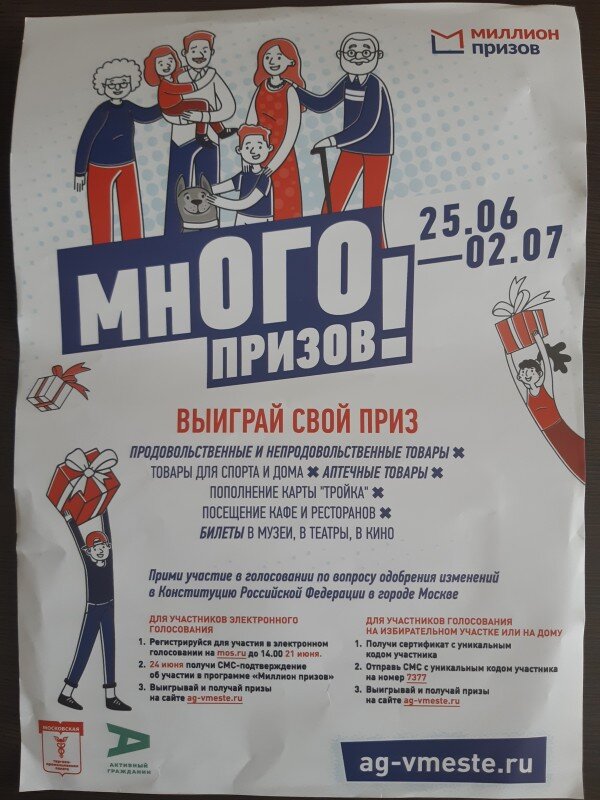 Сейчас по всем почтовым ящикам Москвы разносят вот такие рекламные объявления о розыгрыше призов на голосовании по поправкам в Конституцию. Чтобы получить приз, нужно поучаствовать в голосовании. Будет разыгран миллион призов стоимостью от 1000 до 4000 рублей. На розыгрыш будет потрачено из бюджета города Москвы от 1 до 4 млрд. руб.