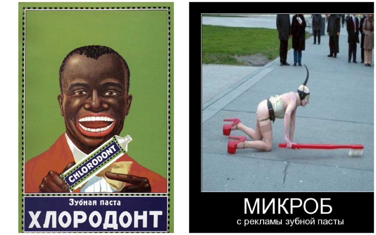 Первая реклама выглядит немного угрожающе, на мой взгляд, зато интернационально. И весьма красочно показан результат чистки этой чудо-пастой. А вот современная
