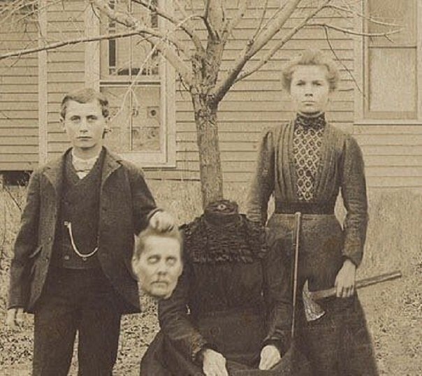 На фото перед нами семейка Бакли. Мать, ее дочь по имени Сюзан и сын Джонни. В том году, в день хеллоуина дети из дома напротив делали чучело, отрезали ему голову и все завидовали их творению. А Джонни и Сюзан решили, что было бы интереснее... сделать «живое» чучело. Вот так и они отрезали топором голову матери. Соседи с улицы ходили к друг другу в гости, и делали фотографии. Кто то, кто зашел им гости первым, не понял, что труп настоящий и сфотографировал. Вот это единственная фотография и сохранилась. Позже соседи позвонили в полицию, но брат и сестра исчезли. Больше таких историй у меня на канале!