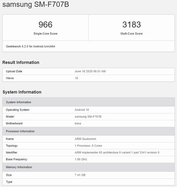 По слухам, компания Samsung готовит обновлённый смартфон с гибким дисплеем Samsung Galaxy Z Flip 5G. Уже по названию понятно, что новинка отличается от оригинального Samsung Galaxy Z Flip поддержкой сетей пятого поколения. В подтверждении этих слухов, в реестре бенчмарка Geekbench появились результаты тестирования смартфона с модельным номером Samsung SM-F707B, который и попадёт на прилавки под названием Samsung Galaxy Z Flip 5G. Из информации, отражённой в результатах тестирования смартфона Samsung Galaxy Z Flip 5G, мы видим, что аппарат построен вокруг топовой однокристальной системы - Snapdragon 865. Ей в поддержку установлено 8 ГБ оперативной памяти, а в качестве операционной системы выступает Android 10. Ожидается, что смартфон Samsung Galaxy Z Flip 5G будет представлен официально 5 августа 2020 года, наряду с Samsung Galaxy Note 20 и Samsung Galaxy Fold 2.