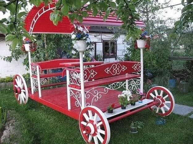 Беседка выполненная своими руками. Автор строения любил в детстве сказку про Золушку. И пожелал что бы его карета не превратилась в тыкву. Беседка изготовлена из металла, а цветы и вензеля
