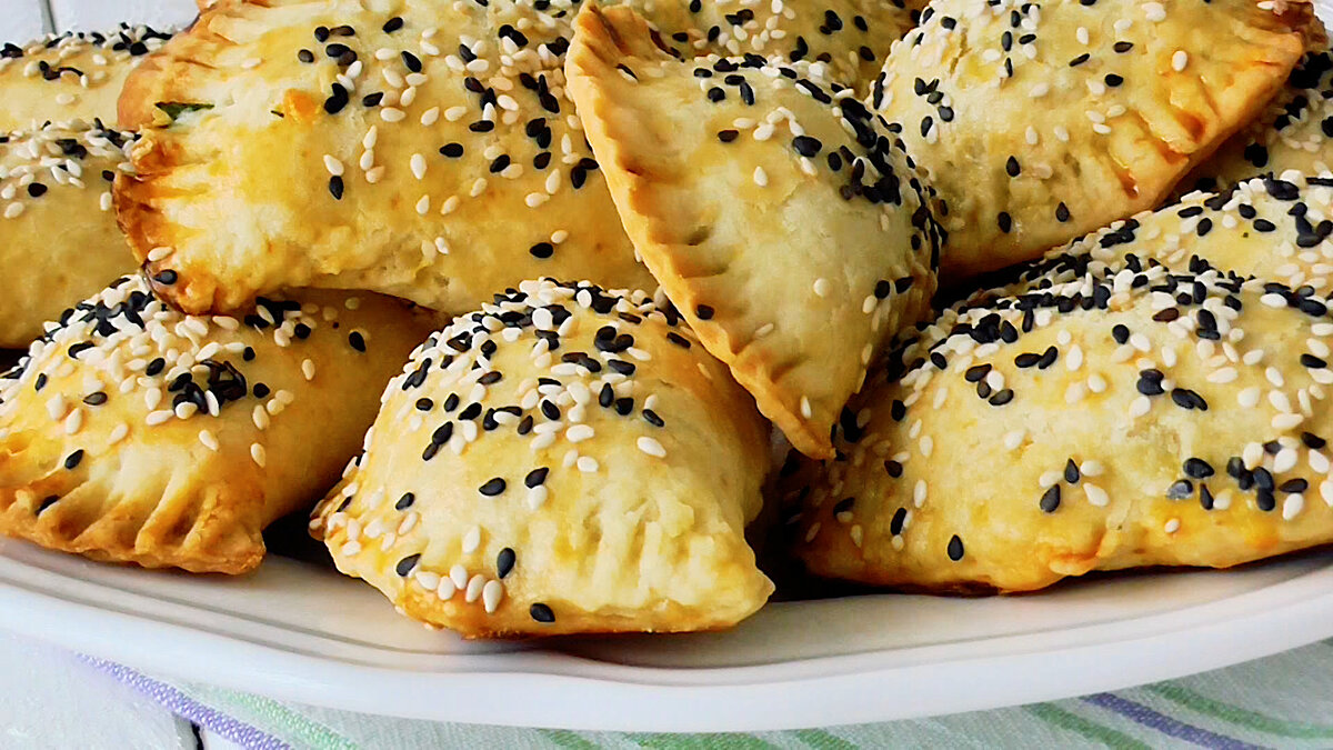 Всем привет! Сегодня покажу рецепт очень вкусных и быстрых пирожков, которые я готовлю для пикника или долгой прогулки по лесу. Это очень интересный и не заморочный рецепт вкусных закусочных пирожков. Тесто у них необычное- такое песочно-слоенное и супер вкусное. В такие пирожки можно положить любую начинку, главное чтобы она не была слишком влажная. Попробуйте и вы такие пирожки и напишите в комментариях! Готовьте с любовью и приятного аппетита! Короткое видео по приготовлению🎬 Ингредиенты📝 *Тесто* -450 гр муки -100 мл растительного масла -70 гр мягкого сливочного масла -70 мл ледяной воды -1 яйцо -1/3 ч.л соли -1 ч.л разрыхлителя *Начинка* -180 гр полутвердого сыра -1 яйцо -3 стол.л творога по желанию -пучок разной зелени -кунжут для посыпки Приготовление✅ 1.К муке добавить соль и разрыхлитель, перемешать. 2.Выложить мягкое сливочное масло и влить растительное масло. 3.Перететь руками в крошку. 4.Добавить яйцо и холодную воду. Быстро замесить тесто. 5.Завернуть тест