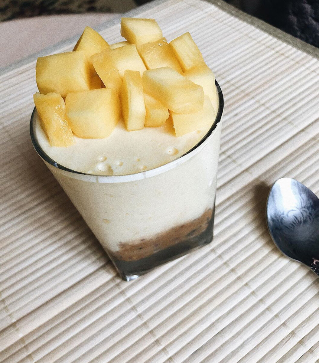 ПП чизкейк🍮 Что нам понадобится: 🍴Манго 🥛Густой йогурт или мягкий творог 100-200г 🍪Печенье 2шт (любое) 🍶Немного молока 💧Вода 100мл 🥄Желатин 10гр 🍭Подсластитель по вкусу 👩🏼🍳👩🏼🍳👩🏼🍳 Разводим желатин с водой и греем на плите или в микроволновке. Желатин должен раствориться. Не кипятим!!! Измельчаем печенье. Измельчить можно при помощи рук, блендера или терки. Добавляем немного молока. Смотрим по консистенции, должно липнуть. На блендере взбиваем йогур/творог, манго и желатин до однородной массы В форму или стакан перекладываем основу из печенья, затем творожный слой Оставляем в холодильнике до застывания на пару часов Вкусное и полезное блюдо готово! Приятного аппетита! Делитесь результатами