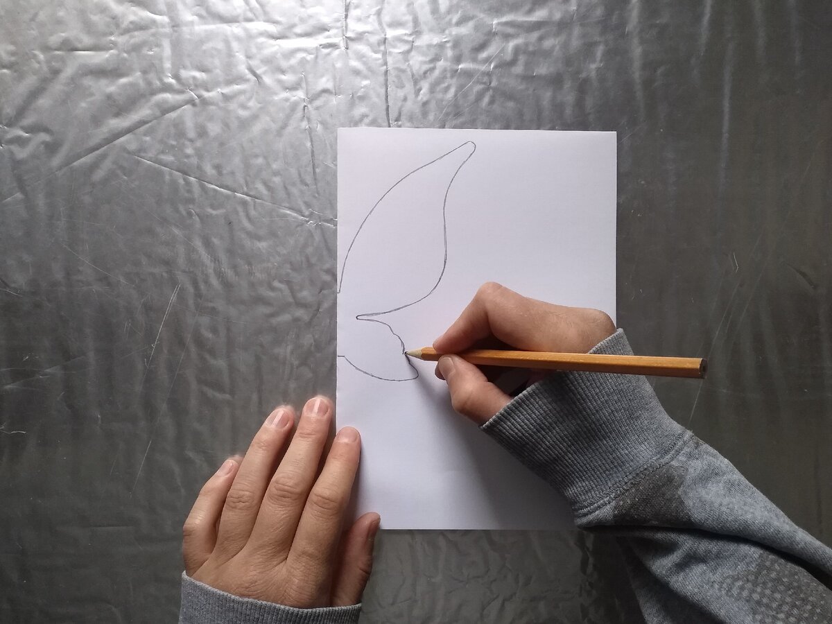 Для начала мне понадобился шаблон для крыльев. Для этого я взяла обычный лист бумаги, сложила его вдвое и на одной части нарисовала крыло.