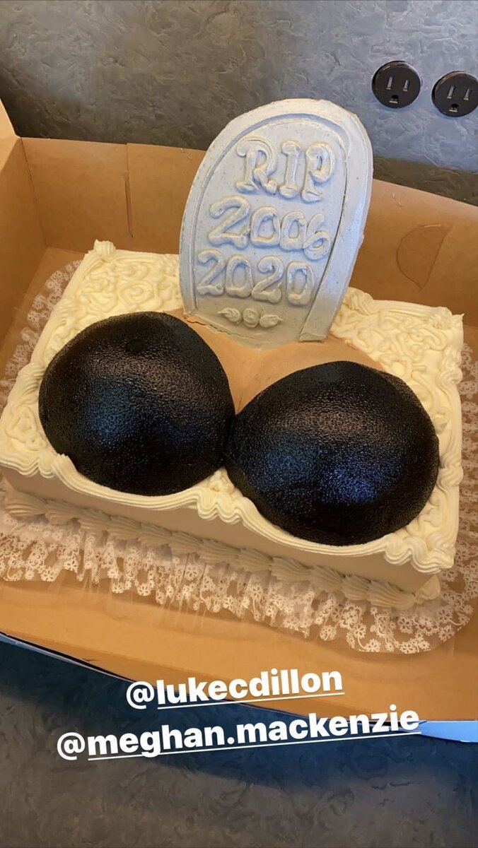 Дома Крисси ждал еще один сюрприз. Накануне модель опубликовала в Instagram фотографию подарка, который прислали ей друзья — это торт, сделанный в форме груди. Рядом помещен съедобный надгробный памятник с надписью «Покойся с миром, 2006-2020».