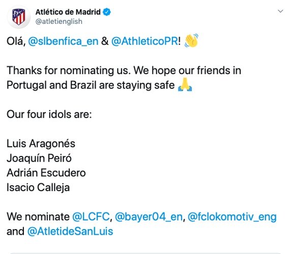 Твиттер "Атлетико" поддержал челлендж "Бенфики" и "Атлетико Паранаэнсе" и опубликовал список из главных легенд в истории клуба, таких как: Луис Арагонес, Хоакин Пейро, Адриан Эскудеро, Исакьо Кальеха. В этой статье вы узнаете больше о каждом из них.