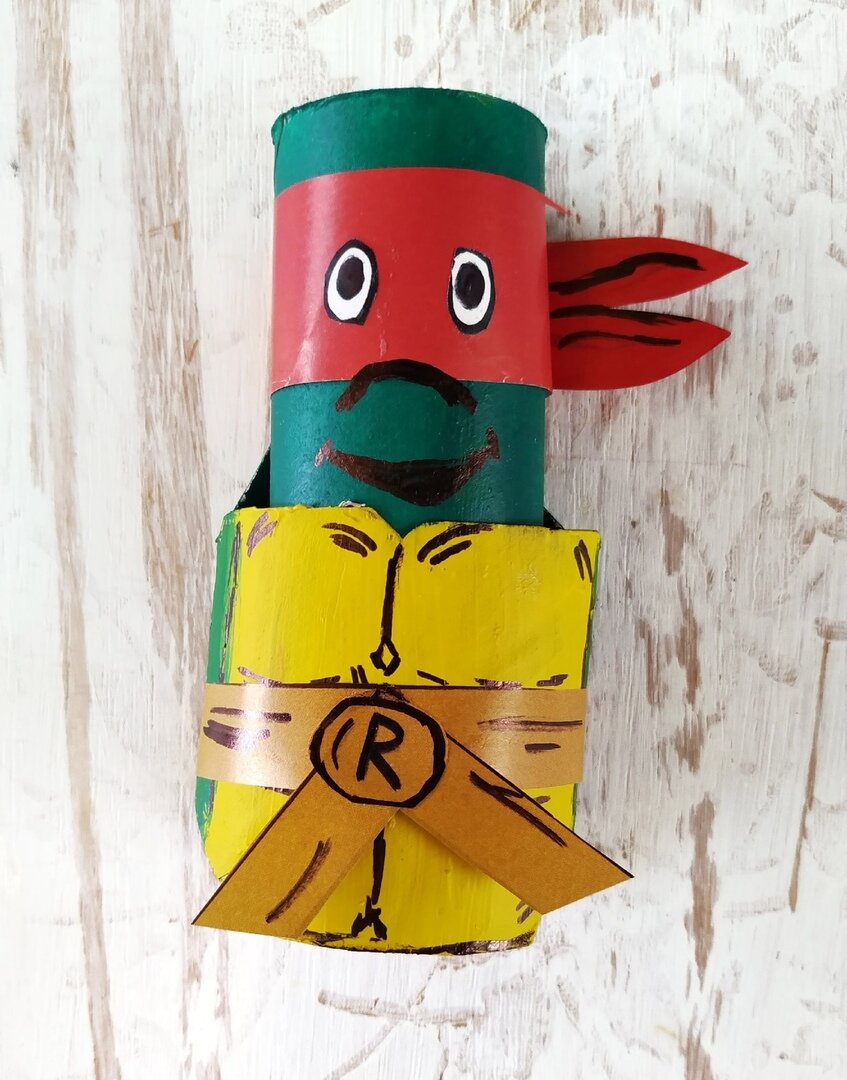 Затем, переднюю часть панциря нужно покрасить в жёлтый цвет, а заднюю — в зелёный. Оставить до полного высыхания краски. Вторую втулку разрезаем вдоль, скручиваем и склеиваем края. Красим в зелёный цвет и тоже оставляем сохнуть. Из цветной бумаги делаем пояс и повязку, как показано на фото. Когда картонные детали полностью высохнут, дорисовываем недостающие детали чёрным маркером.