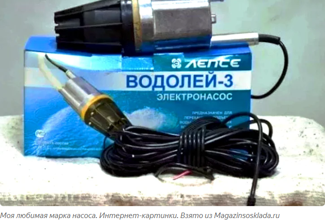 оя любимая марка насоса. Интернет-картинки. Взято из Magazinsosklada.ru Добрый летний солнечный и жаркий день, дорогие друзья! С утра, конечно, поспешил заполнить все ёмкости для полива огорода и, непременно, ёмкость летнего душа. Без него не обходится не один знойный день. В такие погожие денёчки, особенно и не хочется вылезать из душевой кабины, которую посещаешь и не по одному разу. А уж какой это кайф - в жаркий день встать под прохладную и живительную струю, бодрящий дождик! Большую помощь в наполнении наших ёмкостей и оказывает незаменимый помощник, водяной погружной вибрационный насос "Водолей-3", годами работающий безотказно. Скажу откровенно, до момента знакомства с этим агрегатом, перебрал множество различного рода насосов, их изготовителями, а также и насосных станций. Приходилось устранять и неисправности и крупные поломки - вплоть до выброса в утиль. После приобретения случайно, забыл все неприятности прошлых аппаратов. Так как использую сей насос не только летом, но и кр