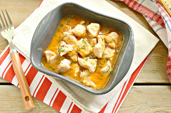 800 г куриного филе, чеснок, черный молотый перец, сушеная зелень петрушки и укропа, растительное масло, соль по вкусу. Из подготовленного промытого филе курицы удалить излишнюю влагу салфеткой, затем нарезать на кусочки, как на гуляш. Чеснок очистить, разделить на дольки, промыть и измельчить. В филе добавить чеснок, перец, соль и зелень. Тушить на растительном масле в течение 25—30 минут. Подать с овощным рагу, украсить петрушкой, ломтиками помидоров.