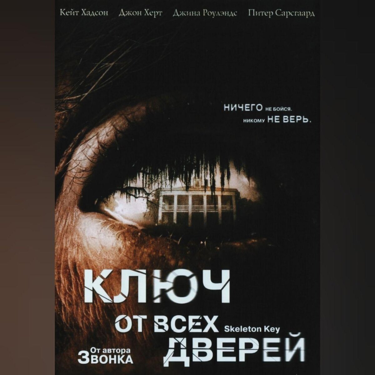 ⠀ Итак, перед нами художественный фильм: По сюжету, молодая девушка Кэролайн Эллис устраивается работать частной сиделкой в особняк пожилой аристократки Вайолет Деверо, чтобы ухаживать за её мужем Беном. Недавно старик перенес удар и теперь его тело полностью парализовано. В первый же день, недружелюбная хозяйка вручает Кэролайн универсальный ключ от всех дверей особняка, чтобы девушка беспрепятственно могла выполнять свои обязанности. В скором времени Кэролайн замечает много странностей. Например, во всём доме нет ни одного зеркала, а на чердаке находится секретная комната, с большим количеством ритуальных предметов. На все вопросы об этом хозяйка уклончиво отвечает, якобы вещи принадлежат бывшим владельцам, которые занимались чёрной магией. Сама девушка всё больше н