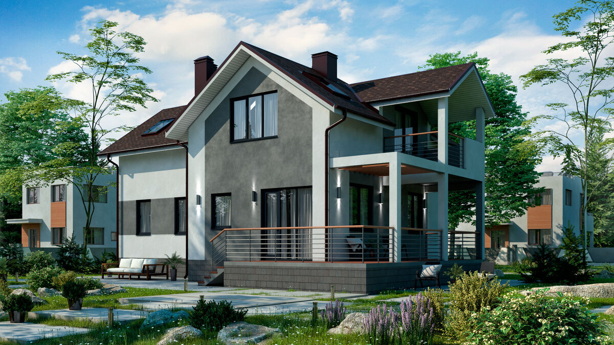 Двухэтажный дом общей площадью 174, 6 кв. метров с террасой и двумя балконами.