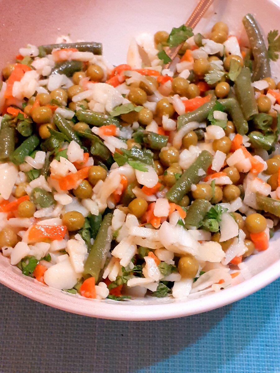 Хочу поделиться с Вами рецептом вкусного картофельного салата. Да, не просто вкусного, но и полезного, так как одним из ингредиентов является зеленый горошек богатый цинком. Итак,