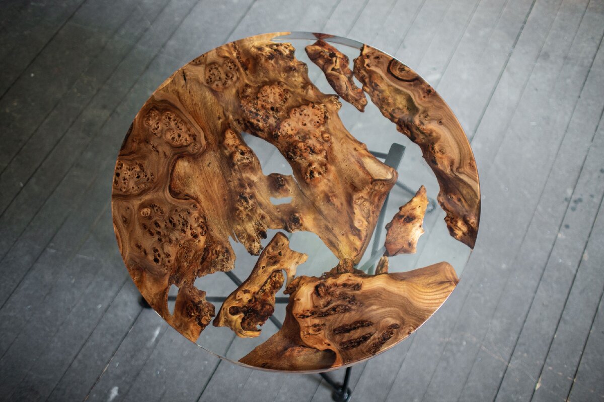 Я самостоятельно разработал дизайн этого журнального стола. Столешница имеет круглую форму, диаметр - 700 мм. Его можно рассматривать как аквариум - красивая текстура карагача, залитая прозрачной эпоксидной смолой, создаёт усиленный эффект линзы, можно рассматривать мелкие и витиеватые края дерева. Высота столика 50 см, это обусловлено стандартами журнальных столов. Металлические ножки придают лёгкость конструкции и не отвлекают внимания от столешницы. Ножки покрашены порошковой краской чёрного цвета. Когда я участвовал в выставке с подобным столиком, он был высоко оценен участниками и посетителями Batimat 2020, который проходил в Москве в Крокус Экспо с 3 по 6 марта. Если у Вас стоит задача приобрести стол, то обращайтесь к нам. Мы сможем выполнить любую задумку или предложить интересные варианты из наличия. И доставить по всей России транспортной компанией. Пишите вопросы в комментарии, обязательно на них отвечу. Можете ознакомиться со всеми нашими работами в инстаграме, ссыл