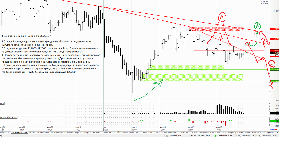 Здравствуйте друзья! Ну что же, вот и закончил жизнь старый контракт на индекс РТС. "Король умер! Да здравствует король!" и начинаем торговать новым, уже сентябрьским контрактом RIU0. Пока остается открытым вопрос, перешли объемы в контракт или нет. Судя по отчету биржи за вчерашний день, уже где то близко к уровню прошлого контракта, но я бы ещё денечек заложил и каких то активных позиций на рынке не занимал. Пускай успокоится все. Пока же, если абстрагироваться от "перехода", у нас продолжает развиваться тенденция вниз. Продажи от уровня продаж ещё идут, локальный минимум в текущей тенденции вниз обновили. Что говорит о её поддержании. А вот покупатель на уровне, пока не выглядит выразительным, цена поднимается слабо. Основное ожидание у меня, это продолжение тенденции вниз. Либо сразу вниз, либо, учитывая позитив в мире, на открытии и наш рынок могут подбросить (произойдет что то вроде снятия стопов) и затем от уровня продаж снова поползем вниз. Цель, в перспективе обновить мини
