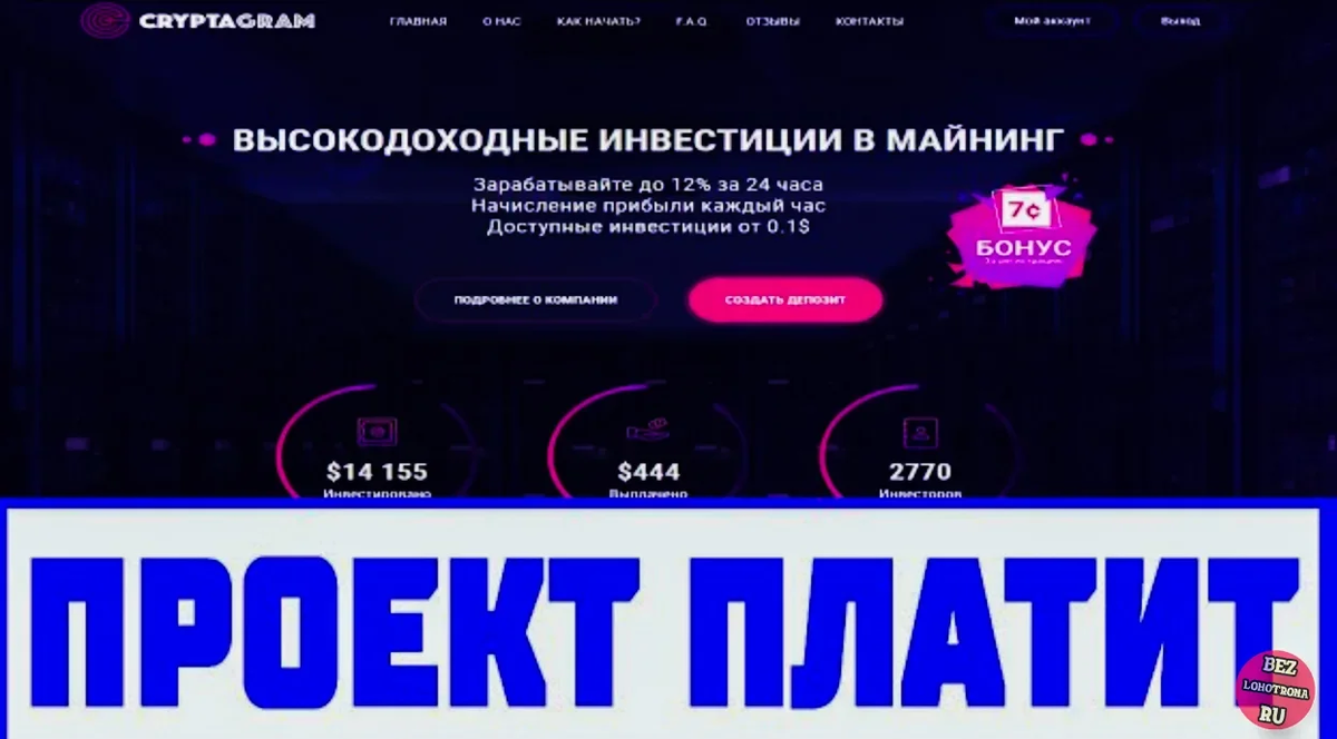 Здравствуйте дорогие читатели, сегодня я расскажу о нескольких проектах на которых вы заработаете больше чем на своей работе. Это все верно. На этих проектах можно заработать больше 30 тыс. это все серьезно, если вы не верите я оставлю вам видеоролик в конце статьи. Ссылки на проекты в конце статьи!!! 1) Cryptagram Проект где можно заработать 12% чистой прибыли и это 12% много как вы думаете, например вы вложили 500 рублей и вам в день будет приносить 30 рублей и главное это окупается и бессрочно! Также на этом проекте есть партнерская программа где также можно заработать на комиссии и пополнениях ваших рефералов. Одним словом проект платит! 2) CGbit Этот проект работает больше одной недели если я не ошибаюсь, инвестиционный пакет ну это тот же почти похожий проект, ну вот инвестиционный пакет 4% в сутки. Есть один минус, что деньги там в долларах, например вы вложили 100$ долларов в день вы будете получать 4$ а в месяц 120$. И 120$ это тоже много. если что на проекте имеется онлайн
