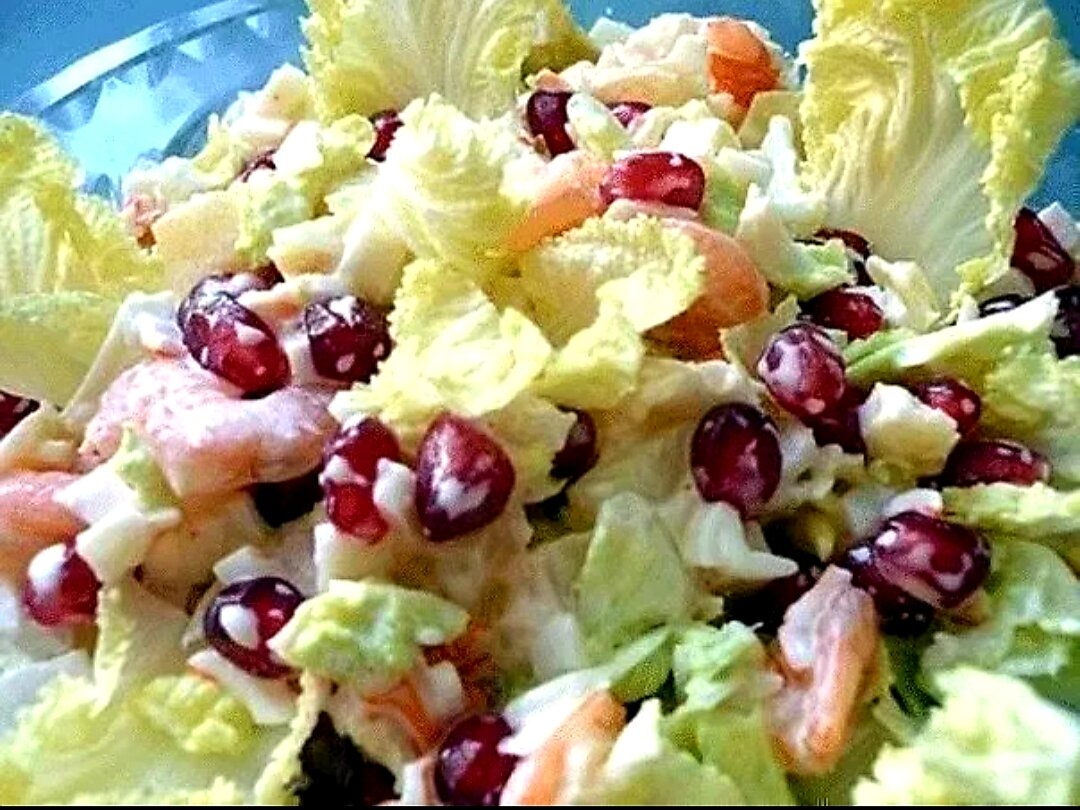 1. "Стрелы амура" Ингредиенты: 1/2 качана пекинской капусты, 300 г коктейльных креветок, 12-15 шт. крабовых палочек, банка консервированных ананасов, спелый большой гранат, майонез, соль. Шинкуем капусту, очень мелко нарезаем крабовые палочки и мелко нарезаем ананасы. Креветки отвариваем. Смешиваем креветки, палочки, капусту, ананасы и гранат. Заправляем майонезом. Ваш салат должен получиться лёгким и воздушным! Приятного аппетита! 2. "На скорую руку" Ингредиенты: капуста, свежий огурец, лук, колбаса (ваша любимая), майонез (сметана), специи. Шинкуем соломкой капусту, огурчики и колбасу. Лук нарезаем полукольцами. Добавляем майонез (сметану) и заправляем специями. Перемешиваем и зовём всех к столу :). 3. "Пекинка" Ингредиенты: пекинская капуста - 300 г, помидоры - 2 шт., колбаса копченая - 100 г, яйца отварные - 2 шт., кукуруза консервированная - 100 г., укроп, майонез, соль, перец. 4 кусочка батона. Капусту нашинковать и помять с солью. Помидоры, яйца, колбасу, зелень нарезать в од
