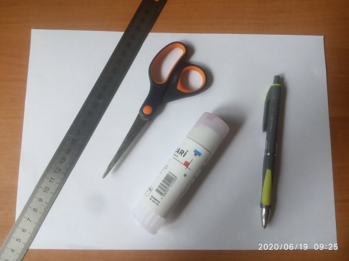 Всё, что нам понадобится - это лист бумаги, линейка, ножницы, карандаш и клей.
