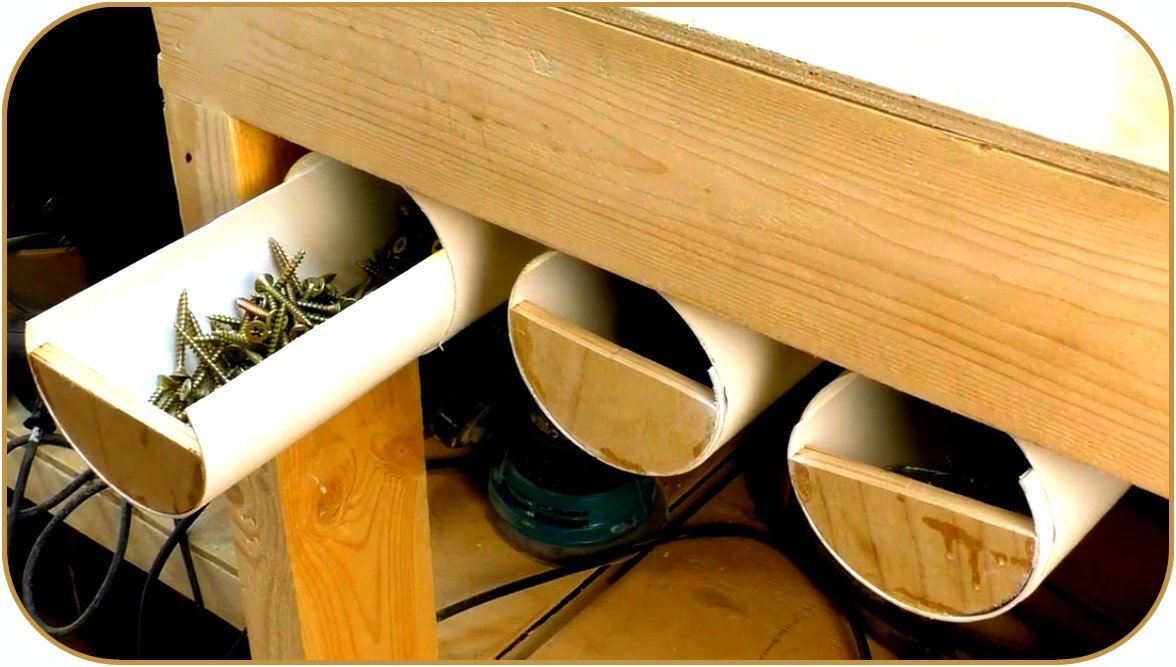 Подробности тут: https://navserukimaster.ru/domashnyaya-masterskaya/udobnye-yashhiki-dlya-xraneniya-melochevki-v-masterskoj Кто из мастеров не мечтает о порядке и комфорте в своей мастерской? Но у большинства не хватает времени для создания систем хранения, да и денег на них обычно не хватает. А что если сделать их из остатков материалов после заказов? Материалы · Канализационная ПВХ труба, диаметр 110 мм; · Фанера, толщина – 8 мм; · Клей синтетический (типа Момент) · Саморезы. Инструменты · Болгарка УШМ; · Электролобзик; · Шуруповерт с длинной насадкой; · Приспособление для шлифовки или шлифмашина; · Сверла; · Наждачка; · Разметочный и слесарный инструмент. Изготовление ящиков для хранения своими руками пошагово Размечаем заготовки из канализационной трубы длиной 25 см (размер можно менять по желанию). Нарезаем их болгаркой. Половину заготовок урезаем вдоль. Отрезок целой трубы выставляем вертикально на фанере, размечаем и выпиливаем лобзиком. Круги из фанеры шлифуем, убирая все