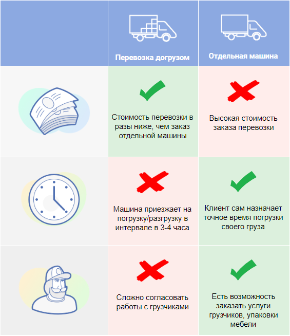 В перевозке "догрузом" имеется основной плюс - стоимость перевозки, она может быть в два-три раза ниже, чем заказ отдельной машины. Минусы - это необходимость подстроиться под дату перевозки, четко знать свой объем вещей и сколько они займут места по полу.