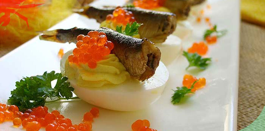 Ингредиенты: Предварительно отвариваем яйца. Как только они сварились, остужаем их в холодной воде, очищаем от скорлупы. Очищенные яйца разрезаем пополам и вынимаем желтки. Берем глубокую мисочку, кладем туда желтки и хорошо их разминаем. Добавляем майонез, горчицу, соль, перец, паприку. Хорошо размешиваем. Выкладываем яичные белки на тарелку и наполняем их получившейся смесью из желтков. Открываем шпроты, достаем по одной штучке и аккуратно выкладываем поверх белков. Рядом накладываем красную икру и по желанию украшаем петрушкой. Блюдо готово. Приятного аппетита! Источник: https://wildcrab.ru/news?id=616