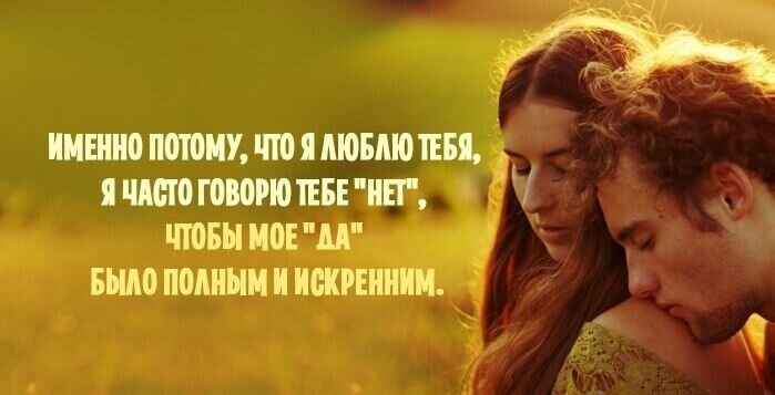 Лишь потому что я люблю тебя... Я никогда не отдам тебе последнее, потому что я люблю тебя. Ибо если я отдам тебе последнее, я буду злиться и обижаться на тебя и уже не смогу подойти близко. Именно потому, что я люблю тебя, я забочусь о себе в первую очередь. Потому что если я не позабочусь о себе, я не смогу дать ничего тебе. Лишь потому, что я люблю тебя, я открываю тебе сердце, даже когда на нем самая темная тьма. Потому что если я не открою его тебе, это будет стоять между нами. Именно потому, что я люблю тебя, я иногда ухожу от тебя и остаюсь в одиночестве, чтобы соединиться с собой и, отдохнув, вернуться к тебе свежим человеком, готовым к общению. Именно потому, что я люблю тебя, я постоянно с тобой ругаюсь и спорю. Я не хочу, чтобы невыясненные проблемы встали стеной между нами. Именно потому, что я люблю тебя, я постоянно ищу и развиваю себя, чтобы потом не обвинять, что я трачу жизнь только на тебя. Именно потому, что я люблю тебя, я не возлагаю на тебя непосильную ношу отв