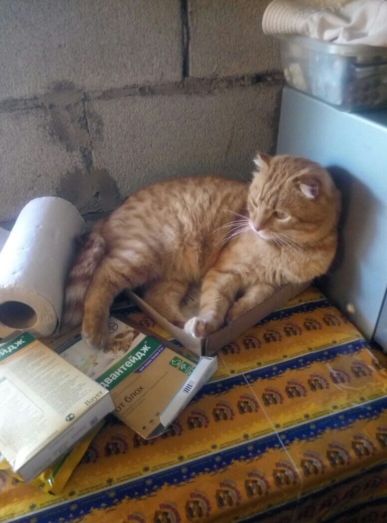 Как мы уже говорили котейки из сельского мини-приюта Ирины С. после обработки стали наслаждаться жизнью, отдыхают целый день. Животные забыли про незванных "гостей" и просто отдыхали Каждый нашел себе местечко по душе. Космос уже может рекламировать капли) Хоть и коробочка мала, но видно удобно ему! Но для котов видимо не бывает маленьких коробочек) Фотомодель!) А у Федора не выдержала коробочка! У Томаса тоже проблема, корзиночка расплелась! Вот разрушители, им что-то попрочнее явно нужно. Ну да, Феня нашла удобный ящик, прочный! Да Феня вообще молодец, хорошо пристроилась) Самостоятельно защитила себя от блох и клещей, не нужно было упрашивать, и ящик самый надежный выбрала! Она Санчо Панчо у Мотика, везде его сопровождает. Ирина С. у Дины забрала лежанку, хотела постирать, так эта парочка уже заняла! Семейное гнездышко прям) Кот Мотик вообще по натуре эгоист, удивительно, но ей позволяет себя любить!