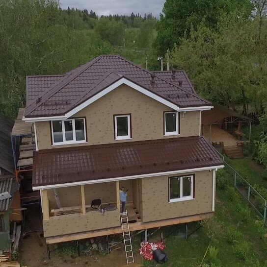 Коттедж полноэтажный с вальмовой кровлей и террасой. Размер дома - 10,5*9 м, площадь - 142 м.кв. В такой отделке - что от кирпича не отличишь