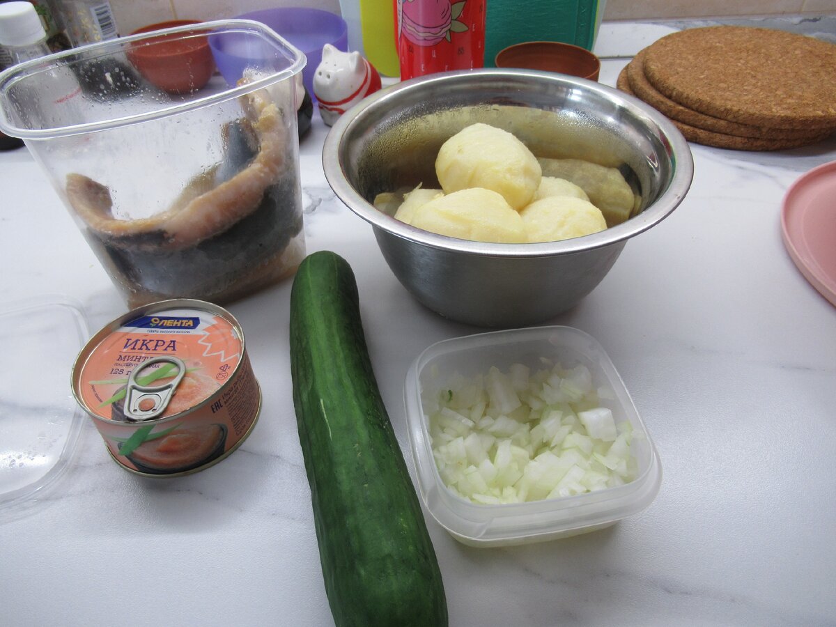 "«Ерундо́пель» (от ерунда + фр. pêle-mêle — досл. лопата+мешать, перен. мешанина, неразбериха) — закусочный салат из икры, рыбы и овощей. Впервые упомянут русским писателем Петром Боборыкиным в романе «Китай-город» (1882). " Из википедии... А в самом деле очень вкусное и простое блюдо. Что интересно, данным или очень похожим блюдом меня угощали в деревнях на берегу Балтийского и Белого моря и Чудского, Онежского и Ладожского озера. А там явно ни о Боборыкине, ни о французских словах понятия не имели. У меня сегодня так себе настроение, поэтому буду готовить... Продукты для ерундопеля у меня есть: Правда, лук был бы вкуснее красный, но вчера в Ленте его не было... Был белый, я его вчера почистила и мелко нарезала. Просто, для мяса нужно было много лука, так что для ерундопеля - заодно... Селедка нужна бочкового посола ,опять же чищенная в Ленте нашлась только развесная... А возиться с целой я не захотела, вечно у меня из большой рыбины получается три ложки филе... Итак, чистим и режем