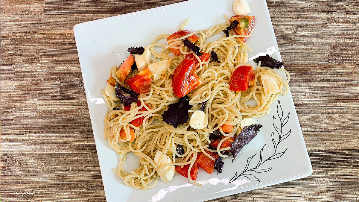 Помидоры и моцареллу нарезать кубиками. Соединить в одной посуде спагетти, помидоры, моцареллу и листики базилика, заправить оливковым маслом и уксусом из белого вина. Хорошо перемешать. (Я в конце ещё немного посолила и поперчила и снова перемешала) готово!
