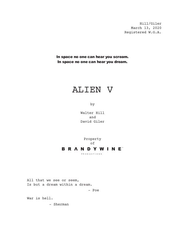 - В сеть попал титульный лист тритмента "Чужого 5" сценариста первых двух частей Уолтера Хилла, который он прислал Сигурни Уивер. Что внутри 50-ти страничного описания сюжета мы можем только догадываться по слоганам «В космосе никто не слышит твоего крика» и «В космосе никто не видит твоих снов». Возможно, если пятый фильм когда-нибудь и доберется до экранов, то сюжетно он будет игнорировать третью и четвертую части.