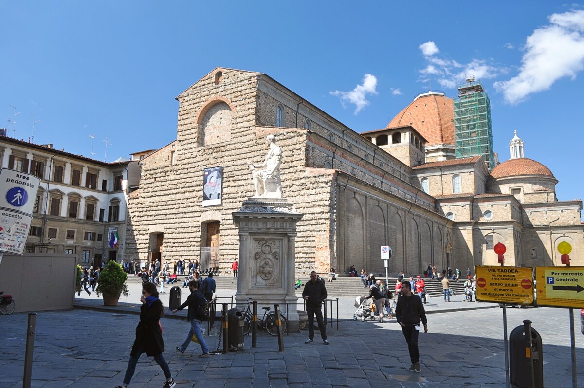 Из-за конфликта с сыном Джованни - Козимо де Медичи (Козимо Старый), Брунеллески был отстранен от работы, его забаллотировали в выборы в Советы Коммуны, и даже посадили в тюрьму. Частично планы Брунеллески, уже после смерти мастера, продолжил его ученик Антонио Манетти. Между 1457 и 1460 годами он реализовал проект главного клуатра (внутреннего дворика) церкви. Он представляет собой двойную крытую галерею, с аркадами в нижнем ярусе и архитравами в верхнем ярусе, с левой стороны фасада базилики.