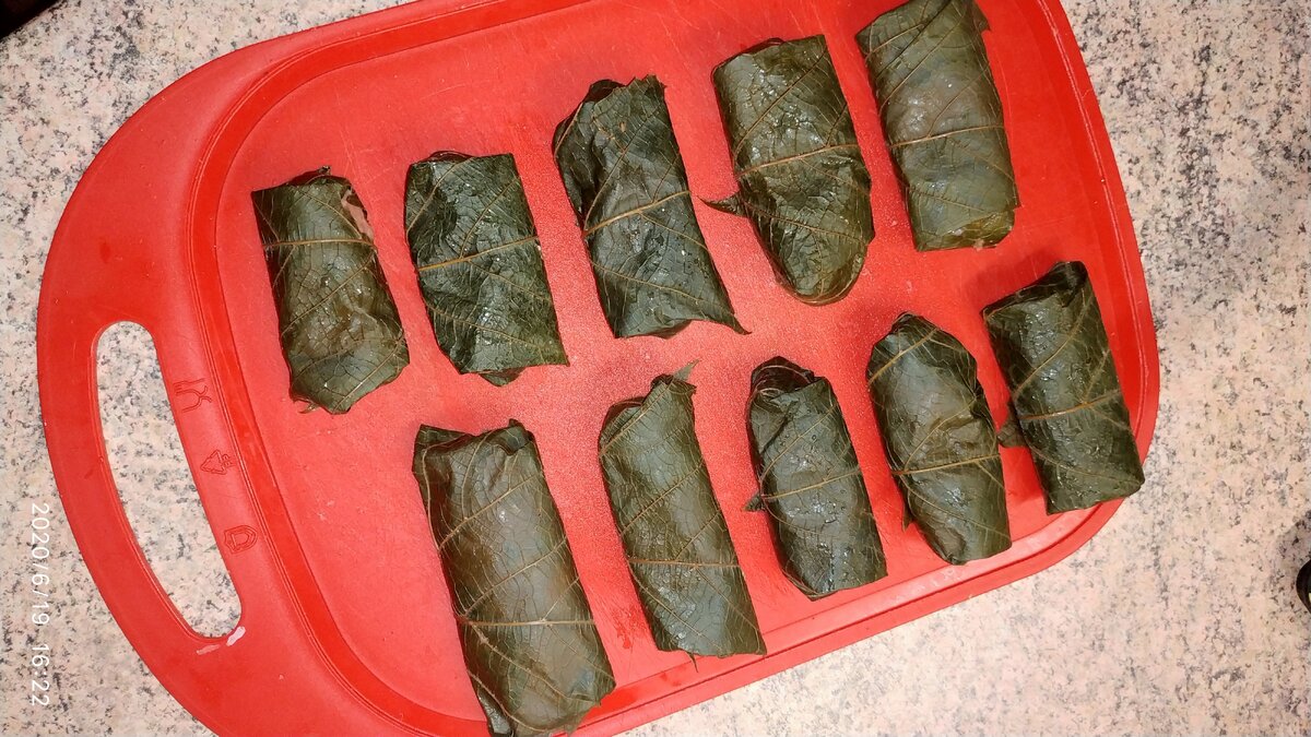 Надоели традиционные голубцы и есть желание попробовать более экзотический вариант,тогда этот рецепт для Вас! Долма — это вариант голубцов. В отличие от традиционного рецепта, согласно которому фарш заматывают в капустные листы, в долме используют виноградные листья. Они меньше по размеру, поэтому порции получаются небольшими и аккуратными. Куриная грудка 400 гр Булгур полстакана Петрушка Виноградные листья 10 шт Чеснок сушёный Соль Перец Куриное мясо перекрутить в фарш.Добавить булгур.К фаршу добавить петрушку,соль, перец,чеснок.Все хорошо перемешать. Листья для долмы нужно срывать свеженькие и молоденькие. Моем и выкладываем в посуду.Нужно обдать кипятком листья,у меня ночь лежали в морозилке и я их просто разморозила.Заворачиваем фарш в листья. Листья заворачиваются лицевой, глянцевой стороной наверх. Начинать заворачивать нужно с черенка,подворачивая боковые листочки. Вот наша Долма готова!!! Приятного аппетита!