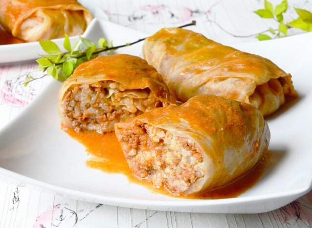 Название этого блюда всем знакомо: «голубцы» (рецепт с рисом и фаршем) – это классика многих славянских кухонь. Есть много версий того, как появилось это блюдо. Одна из них заключается в том, что блюдо «голубцы» появилось под влиянием французской кухни, популярной во многих странах во второй половине XIX века. В богатых домах французские повара подавали жареных голубей, завернутых в капустный лист. Менее богатые горожане видоизменили рецепт, заменив начинку капустного листа на более доступную (каша с мясом) и назвав блюдо «голубец» – то есть почти голубь, или фальшивый голубь. Фаршированные мясом и крупами голубцы томили в томатной или сметанной подливе. На сегодняшний день это самые распространенные ингредиенты для голубцов, хотя есть масса вариантов: в частности, есть много рецептов постных голубцов, наполненных гречкой, грибами, картошкой, овощами, а также различными сочетаниями мяса, овощей и круп. Для обертывания используют свежие или маринованные листья капусты, которые весной за